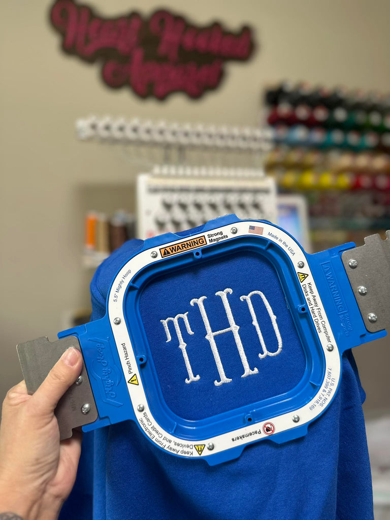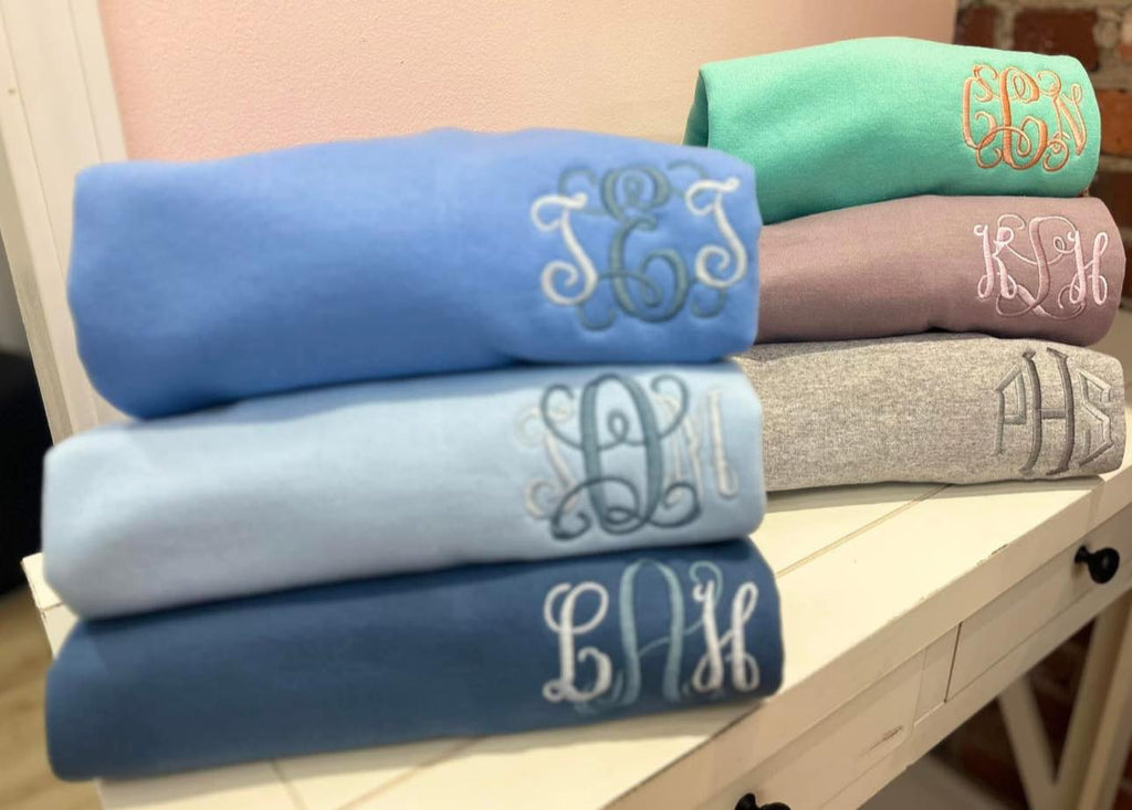 Choose your sweatshirt color from the chart in the photos provided, the font you'd like as well as two threads (you can choose 1 thread as well if you rather not do two) and leave those in the notes at checkout, don't forget your monogram